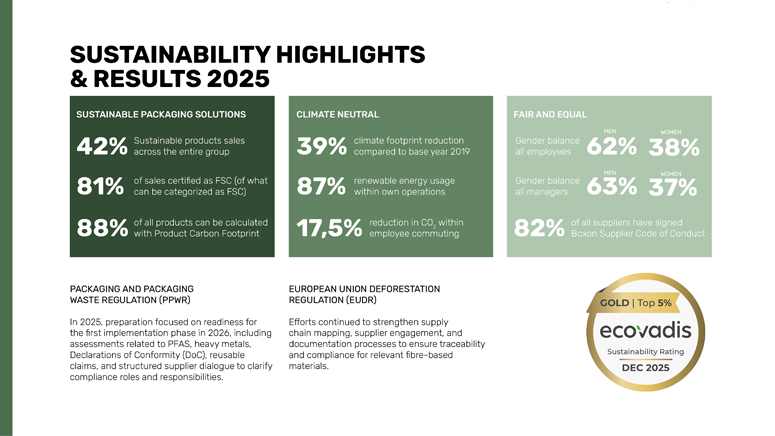 Es wurde viel Zeit und Ressourcen in die Vorbereitung auf die kommenden regulatorischen Anforderungen der PPWR und EUDR investiert, Anforderungen, die sowohl für Boxon als auch für unsere Kunden entscheidend sind.